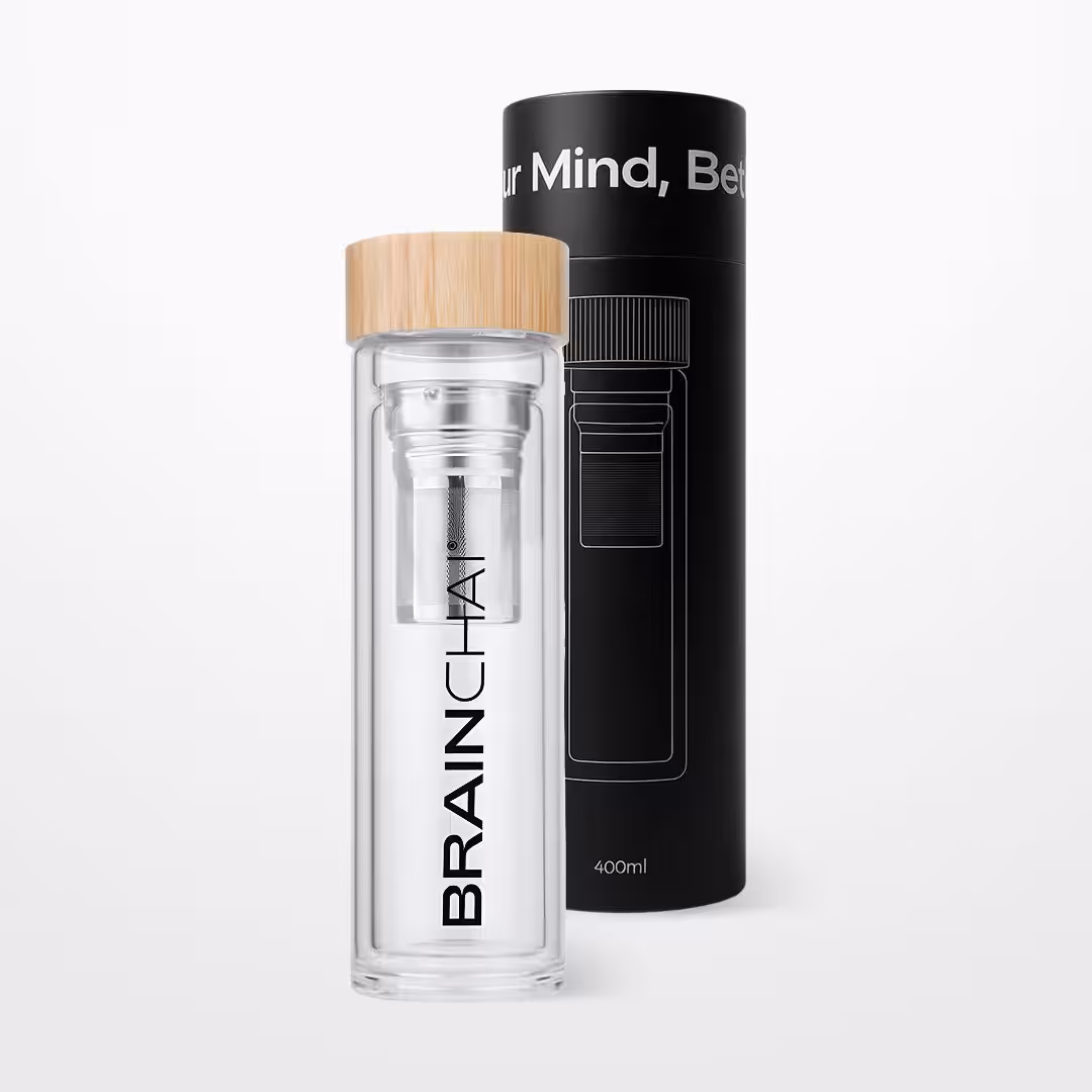 BrainChai – Премиум бутилката е стилна и практична бутилка, създадена за истинските любители на чай. Изработена от закалено стъкло с двойна стена, тя запазва напитката топла или студена до 6 часа. Вградената фина цедка позволява лесно приготвяне на чай или инфузия директно в бутилката, а бамбуковата капачка придава естествен и елегантен завършек.
