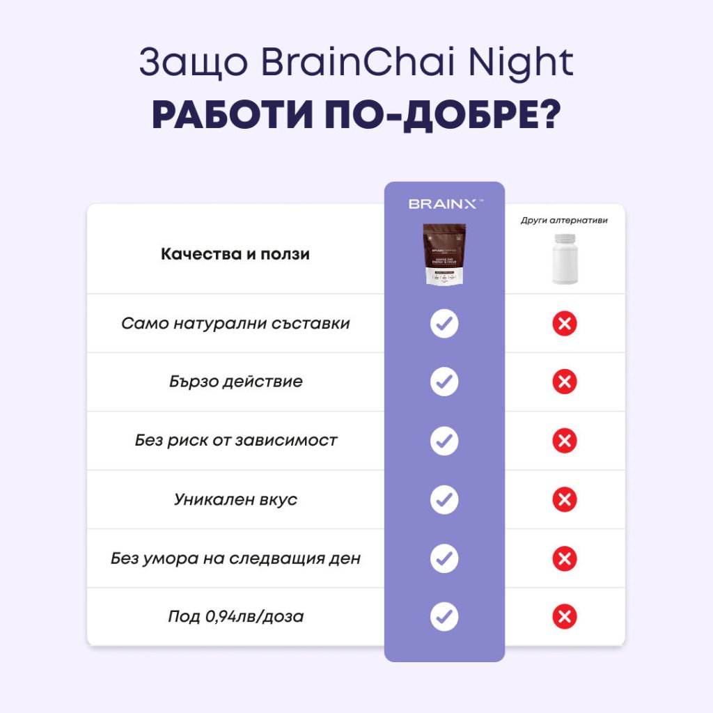 Няма наблюдавани странични ефекти при употребата на Brainchai Night. Продуктът съдържа само натурални билкови съставки, внимателно подбрани за техните успокояващи свойства. Единственото изключение би било, ако имате специфични алергии към някоя от активните съставки – в такъв случай, моля, избягвайте консумацията.
