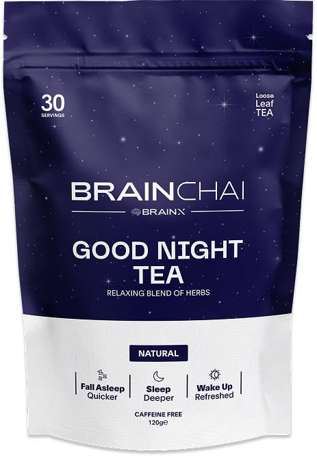 BrainChai Night е билков бленд, който успокоява ума и тялото, улеснява заспиването и намалява стреса.